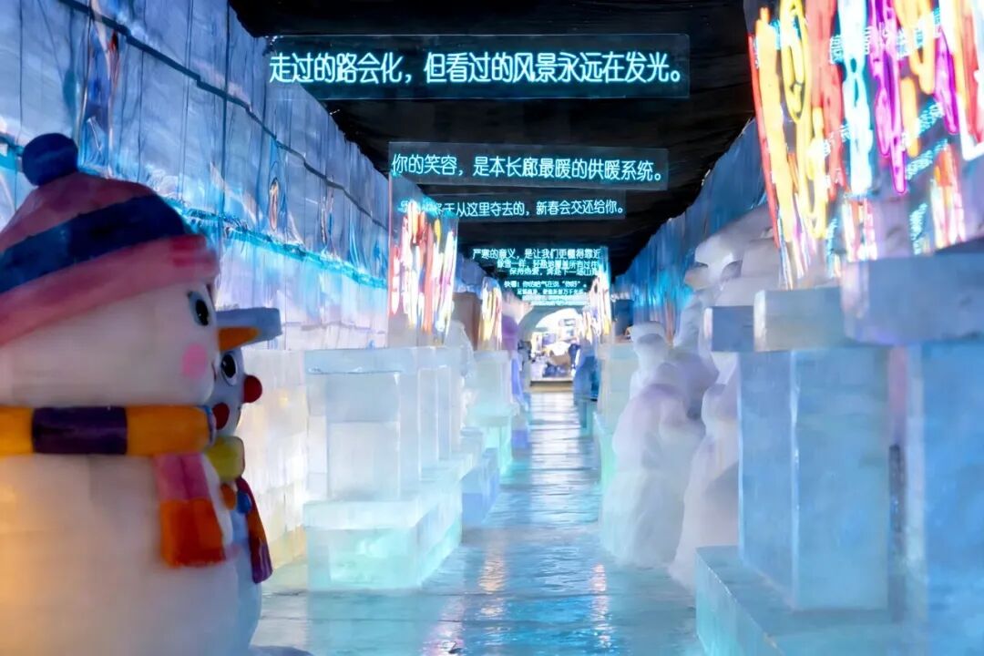 再往前行,便是“时光隧道”——LED灯带随步流转,实现场景化沉浸式体验,节庆光影在冰壁间流淌,满眼皆是陕北年的浓情,步步尽遇塞上冬的欢喜。