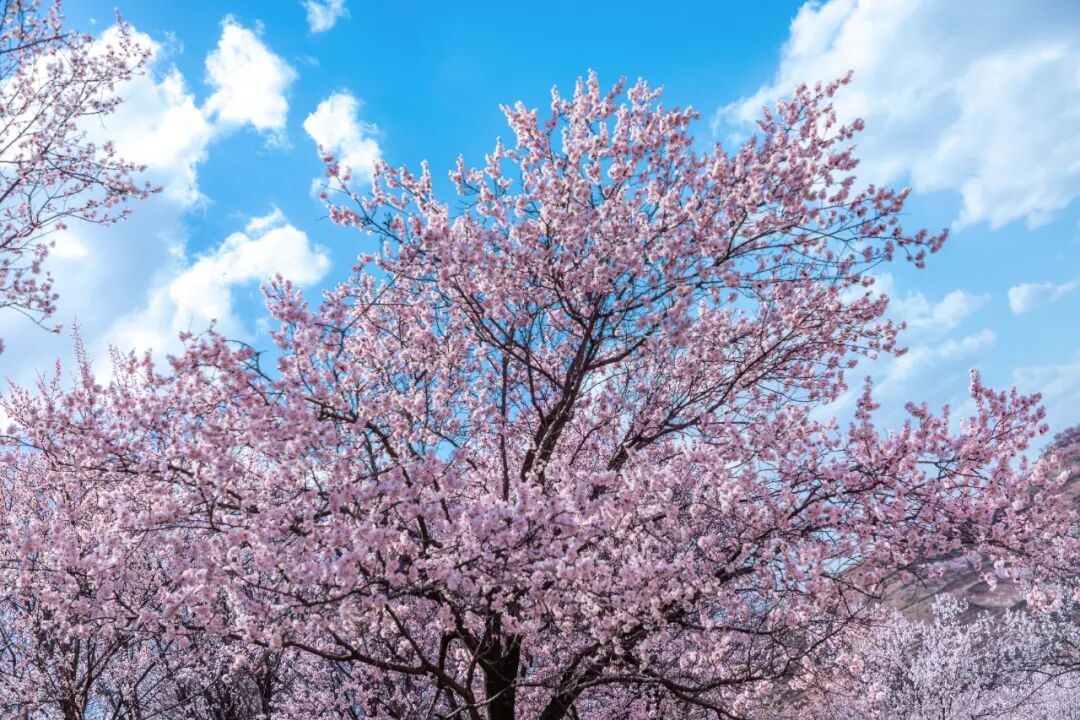 粉白的花海与天际的澄澈晴空相接